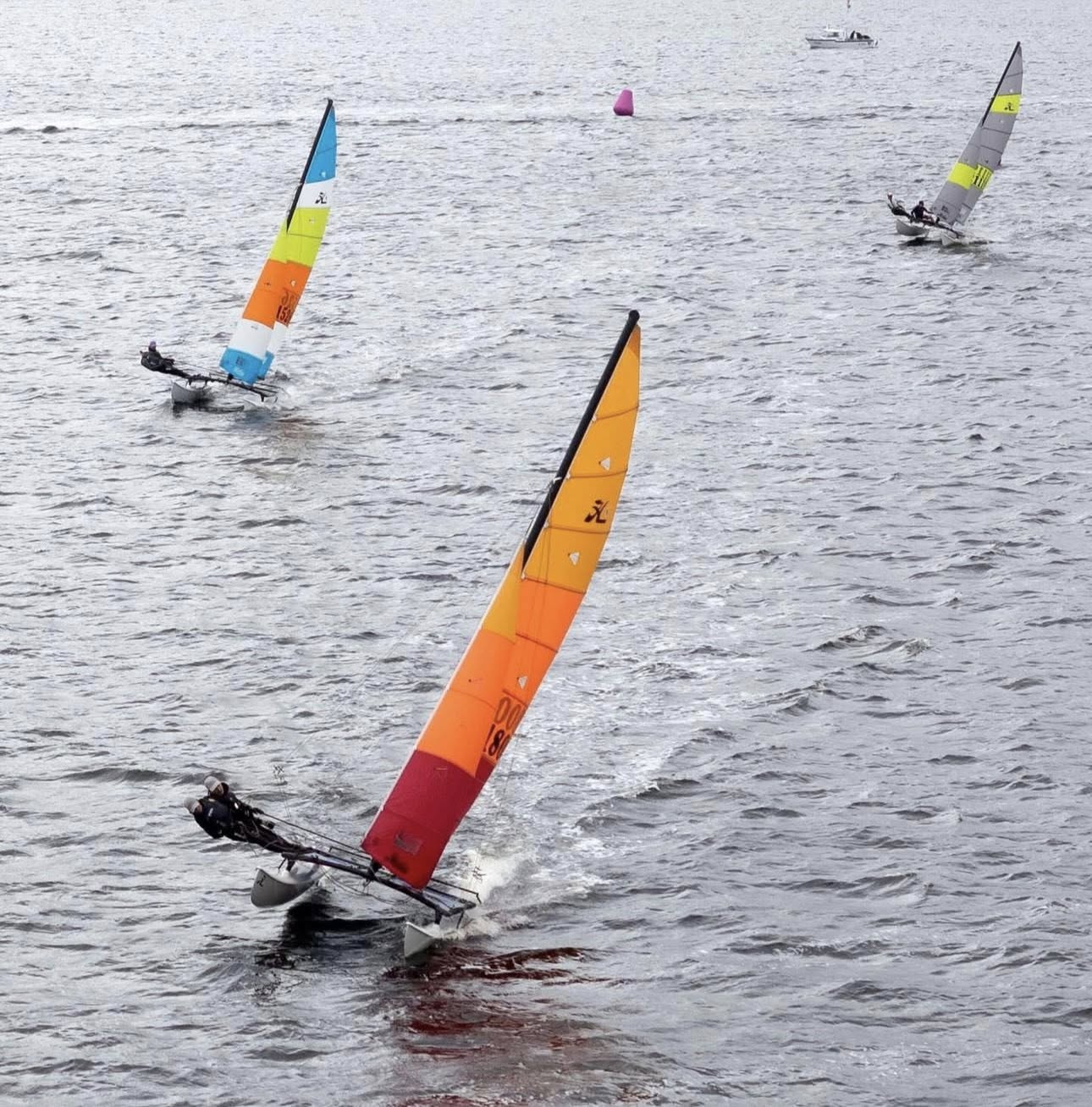 The Hobie 16 fleet enjoyed fast and close racing in the steady winds. Fresh from the recent European Championships, Cam Owen & Suzzi Ghent had three wins but a fifth in race two, unable to break through the strength of their local fleet who will always provide a good challenge. They came out on even scores at the end of day one with Darren Smith who also competed in the event in Utska, Poland. For the Cat Classic Regatta he sailed with local 29er sailor Finley Symonds and they sailed consistently picking up a 2, 1, 3, 2. Just as consistent was Trent Robson & Jasmine Hill with a days total of ten points. Always a strong team in the breeze, Jess Symonds / Stu Collison had a good day apart from a penalty in race one, it was a similar story for Brad Quartermaine / Nat Waddell.
