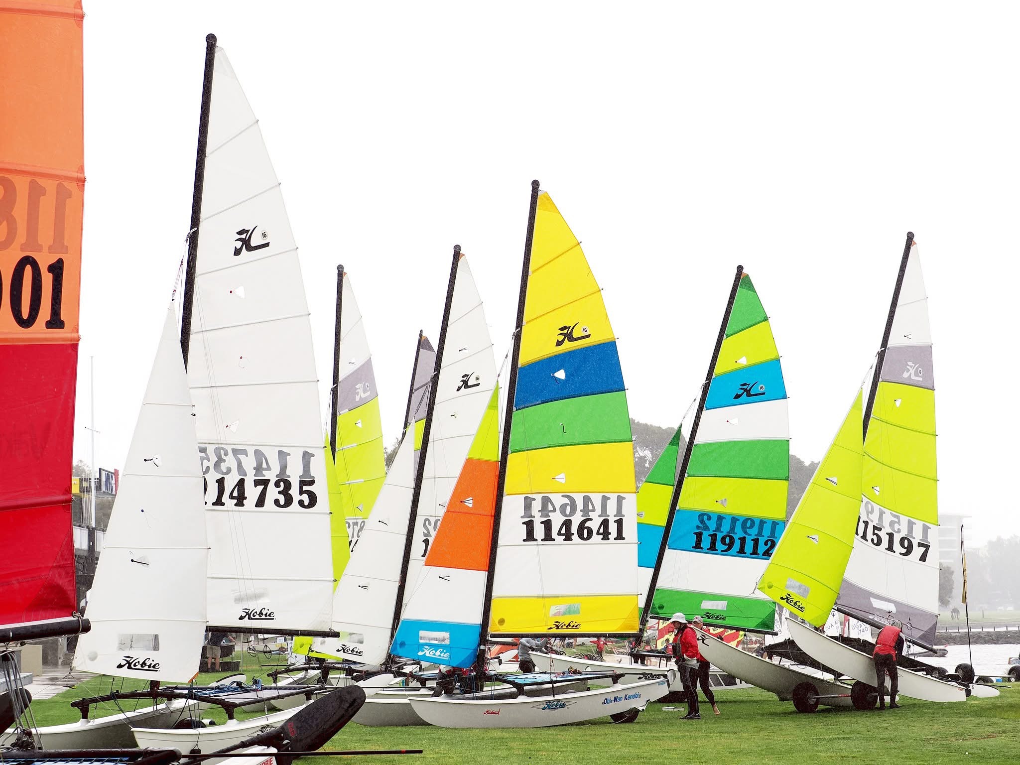 The first Cat Classic Regatta was held in 1977 and won by Mal McKercher and crew on a Hobie 16. Traditionally a single fleet yardstick event, this year it was decided to split in to divisions. Division A was for boats with a yardstick lower than 76 and consisted of a mixed F18 fleet. Fourteen Hobie 16’s and one Nacra 14 Square contested Division B for catamarans in the 76 to 85.5 range.