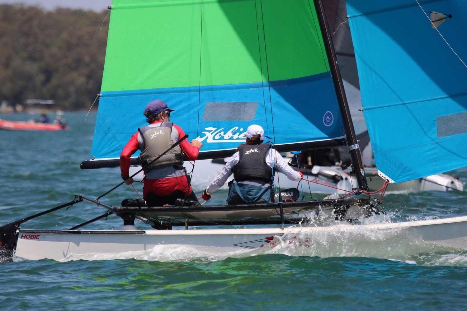 This year, five Hobie 16s lined up for their State Championships, a drop from previous seasons, while a healthy number of Hobie 18s joined the Big Boat Regatta for the very first time — many experiencing what could only be described as a baptism of fire. Among them were Henry Makin & Jessica Brown, who had purchased their very first Hobie 16 only weeks earlier and were racing their first-ever regatta as a team.