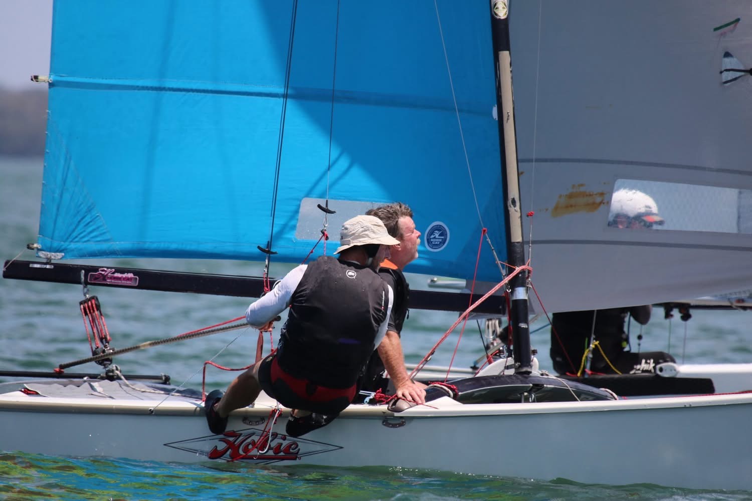 Sophie and I managed to claim the first two wins of the day, while Dave & Ainslie remained ultra consistent with a pair of seconds. But it was Race 3 where the conditions truly escalated. Halfway down the final run of Race 2, a cool puff wafted in from the nor’east, carrying the faint smell of bushfire smoke. Moments later, the last beat to the finish became a screaming reach as the seabreeze slammed into the dying westerly.