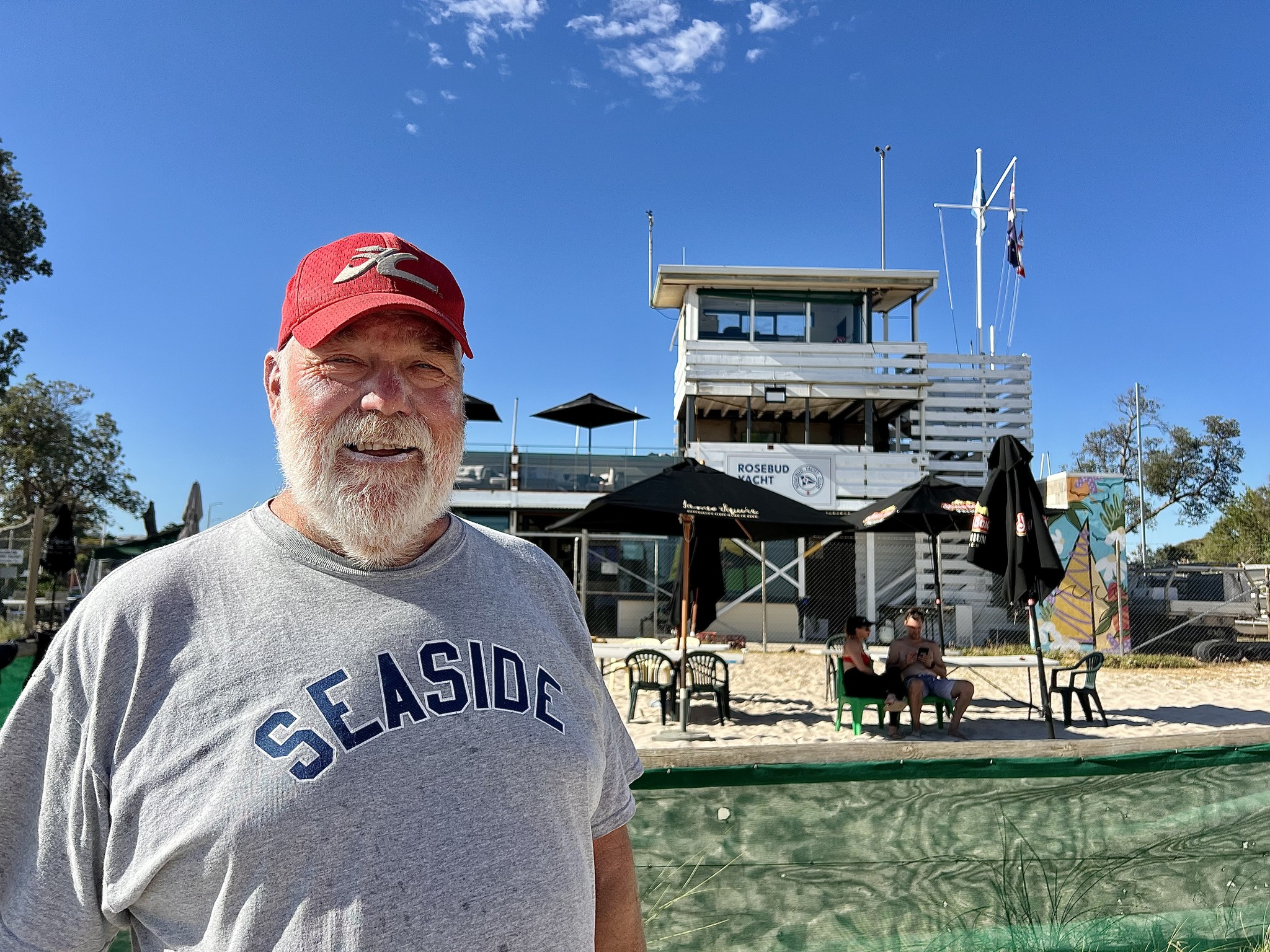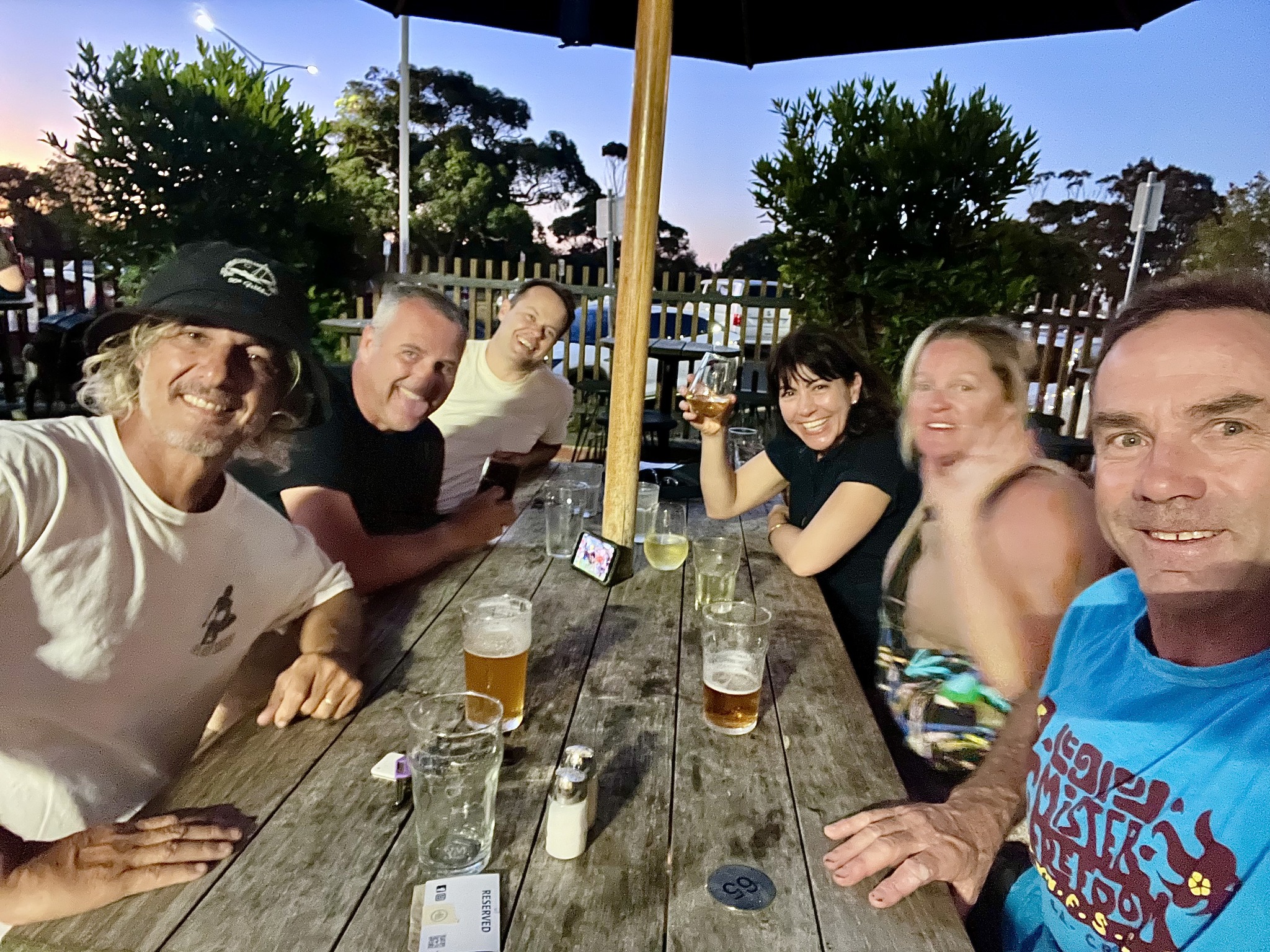 A few diehards rolled into the Rosebud Yacht Club gates on Friday night, greeted by hot and dry weather. We set up the Hobies and then spent the rest of the balmy evening at the Rosebud Hotel, relaxing in the beer garden, drinking ales, and reminiscing about Hobie adventures while a local musician entertained us on his acoustic guitar.